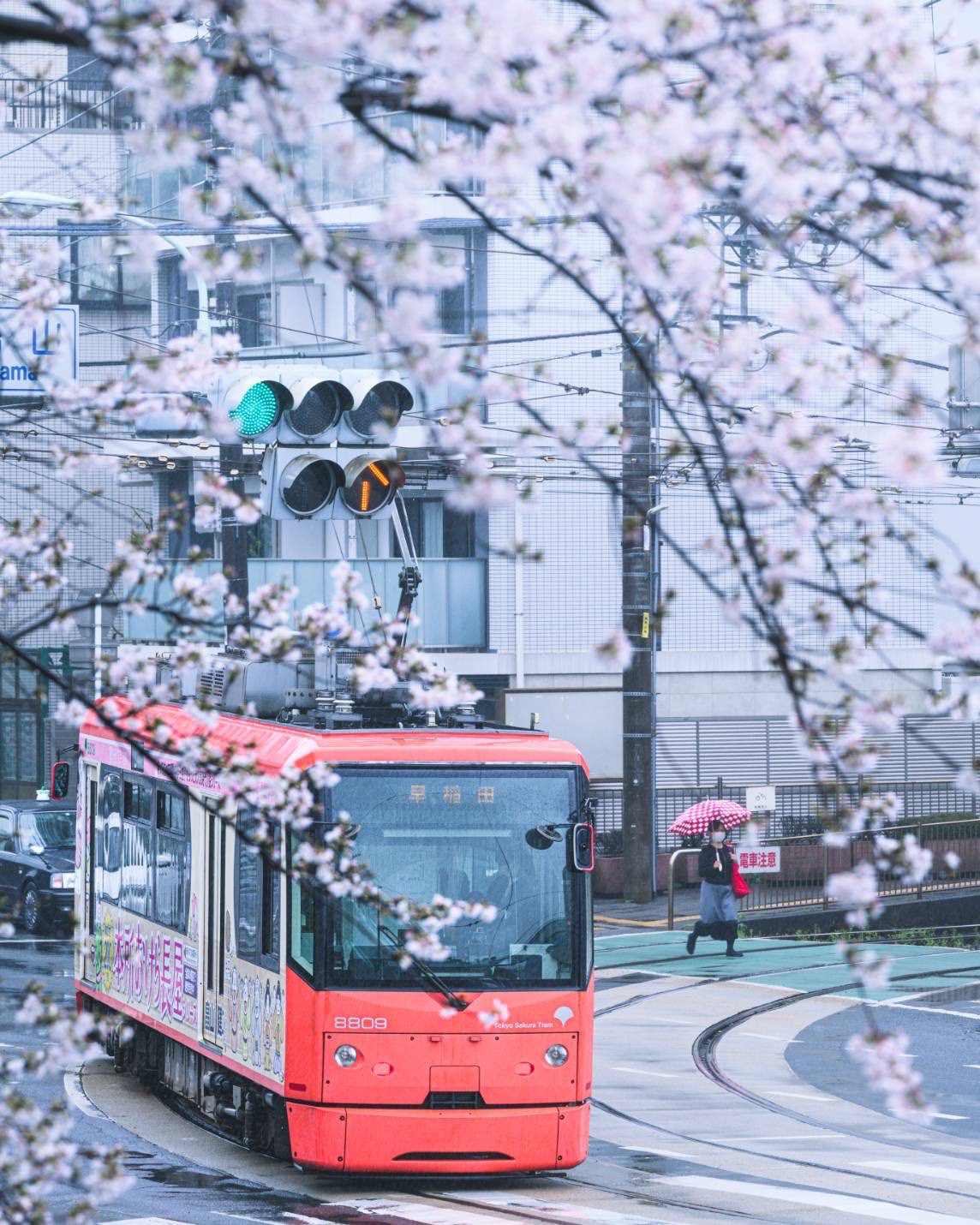 入口付近では、都電と桜が交差する瞬間を狙い、一枚一枚丁寧に撮影を行いました。